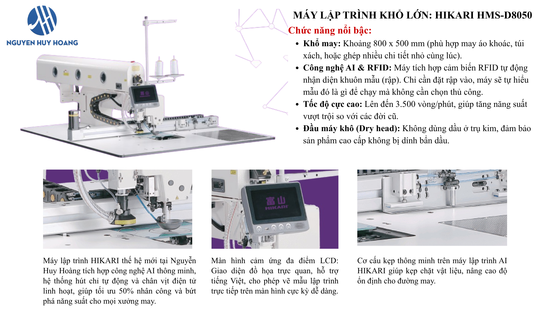 Tự hào là đơn vị cung cấp giải pháp may mặc hàng đầu tại TP.HCM, Công ty Nguyễn Huy Hoàng mang đến thế hệ máy lập trình HIKARI AI mới nhất. Với công nghệ tự động hóa vượt trội, chúng tôi giúp các xưởng may tối ưu 50% nhân công và bứt phá năng suất ngay hôm nay.
